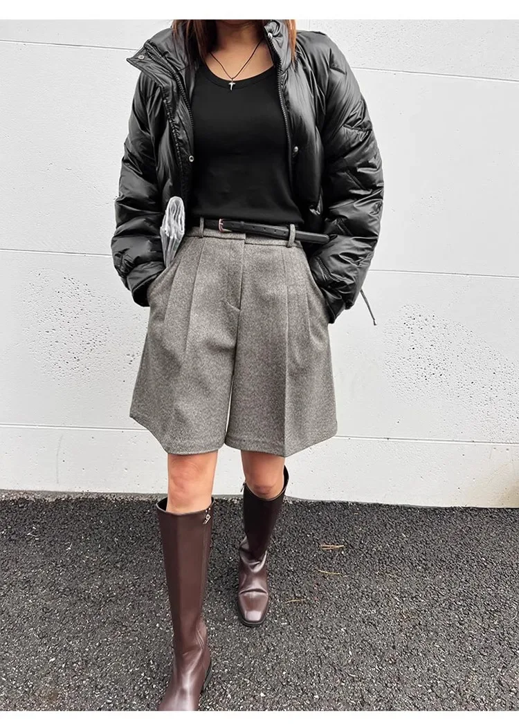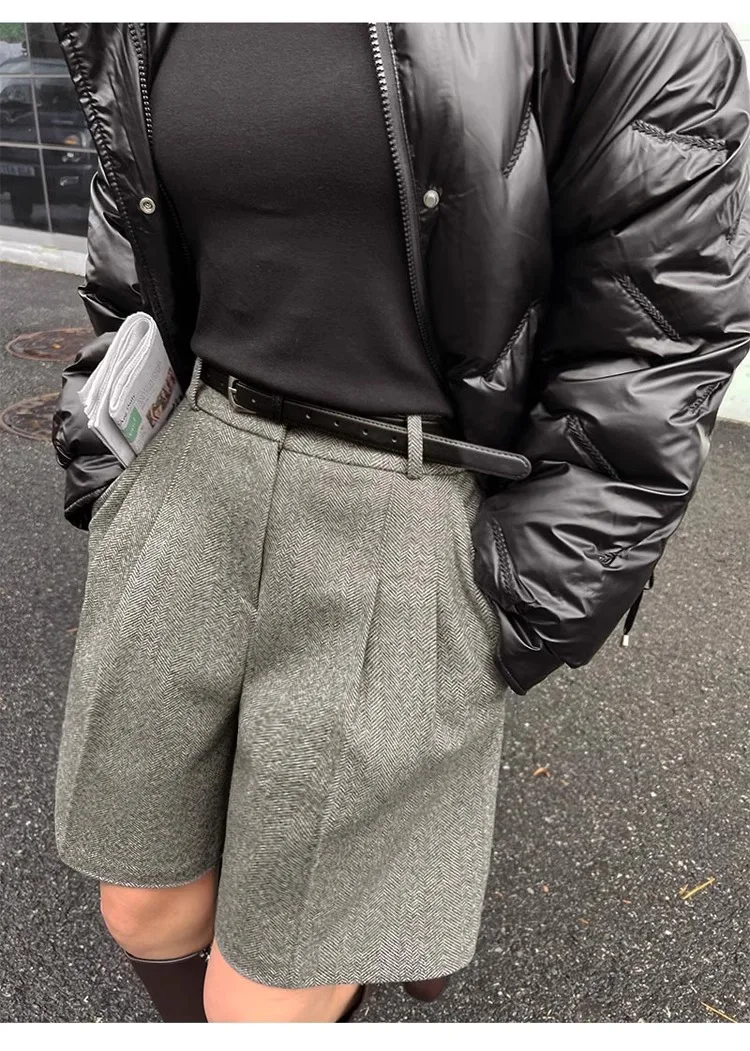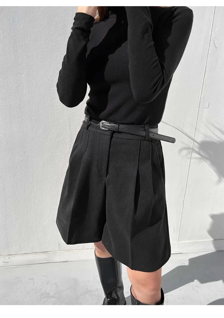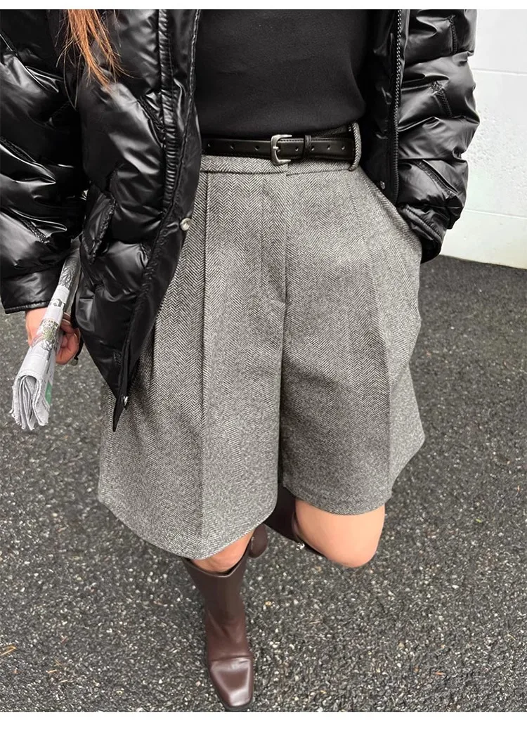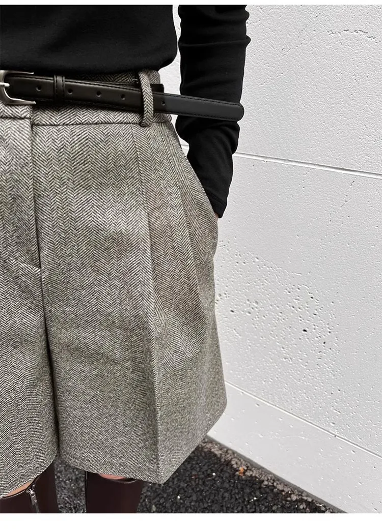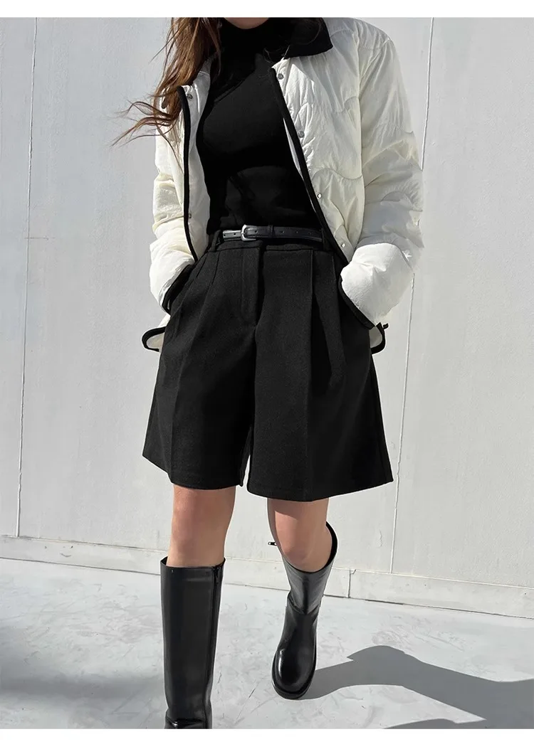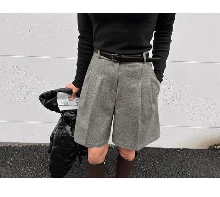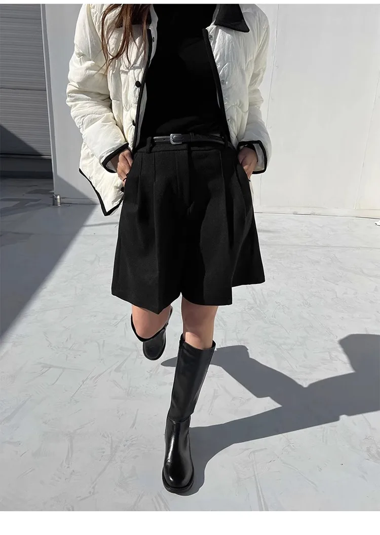 Chic Women Thicken Warm Loose Pockets Faux Woolen Straight Shorts 2024 Autumn Winter High Waist Ladies Wide Leg Shorts WH2
