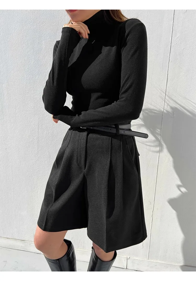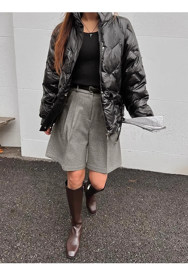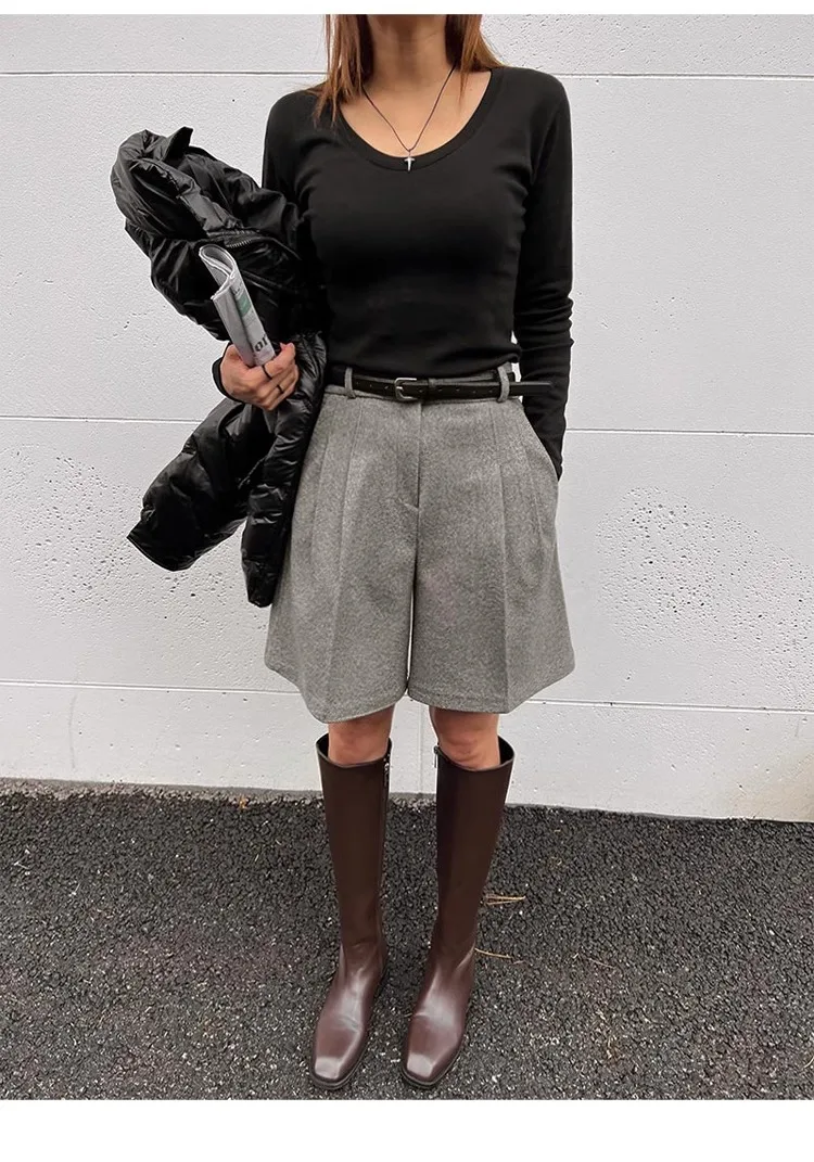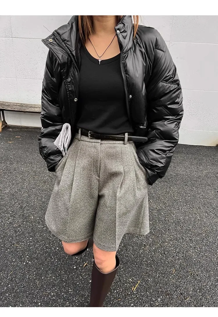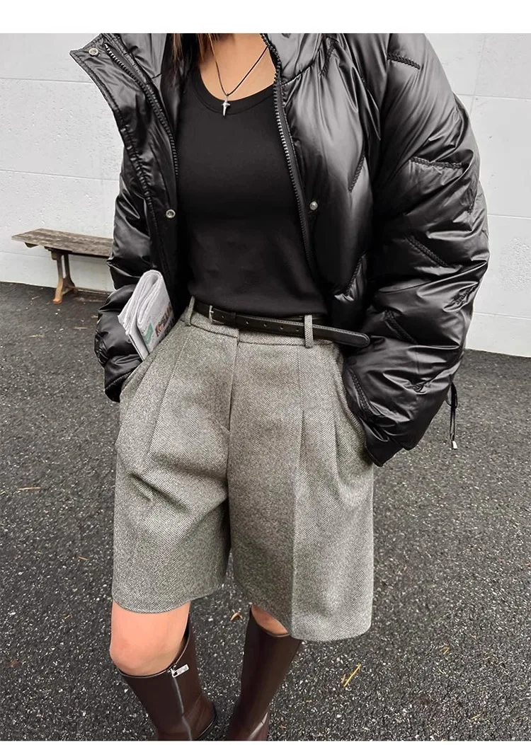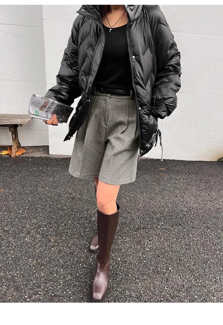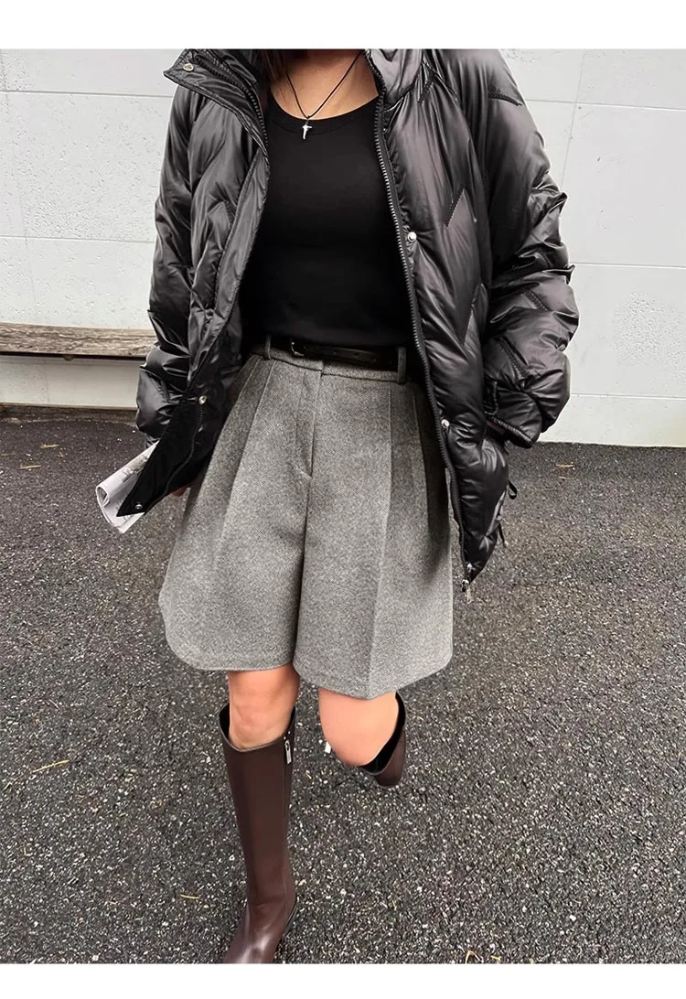Chic Women Thicken Warm Loose Pockets Faux Woolen Straight Shorts 2024 Autumn Winter High Waist Ladies Wide Leg Shorts WH2