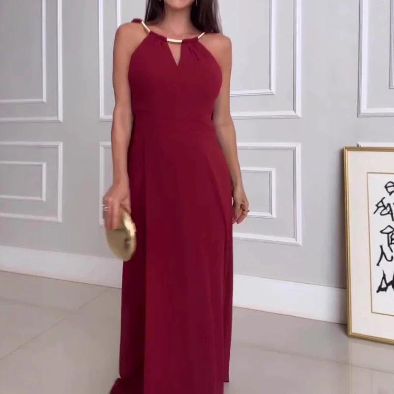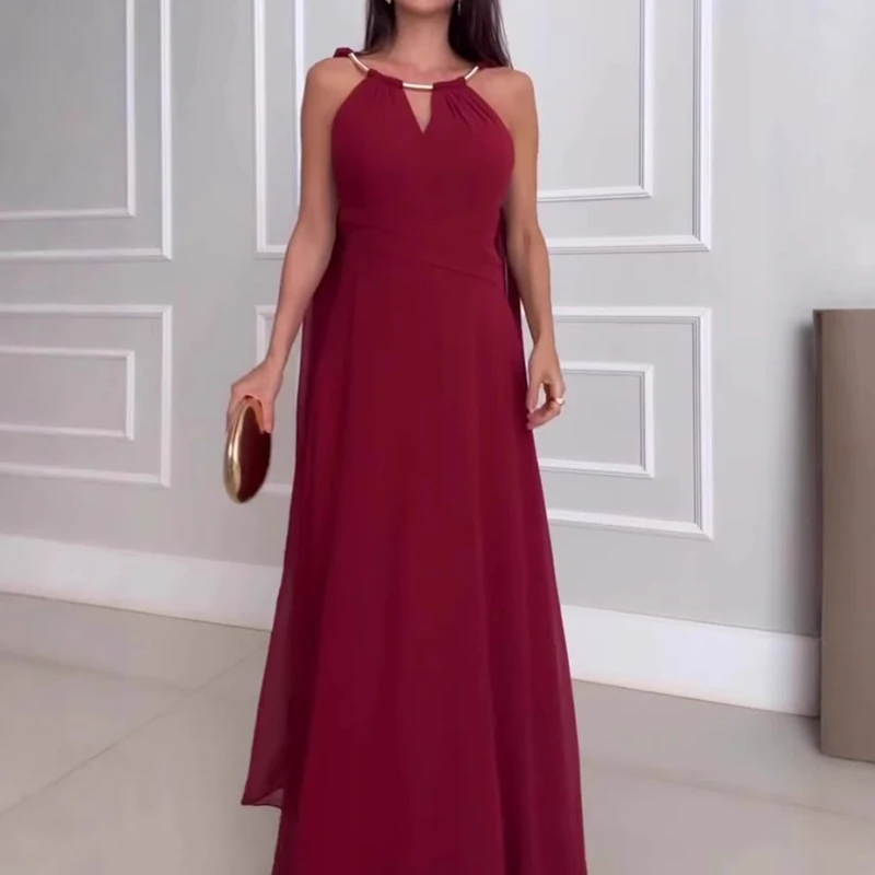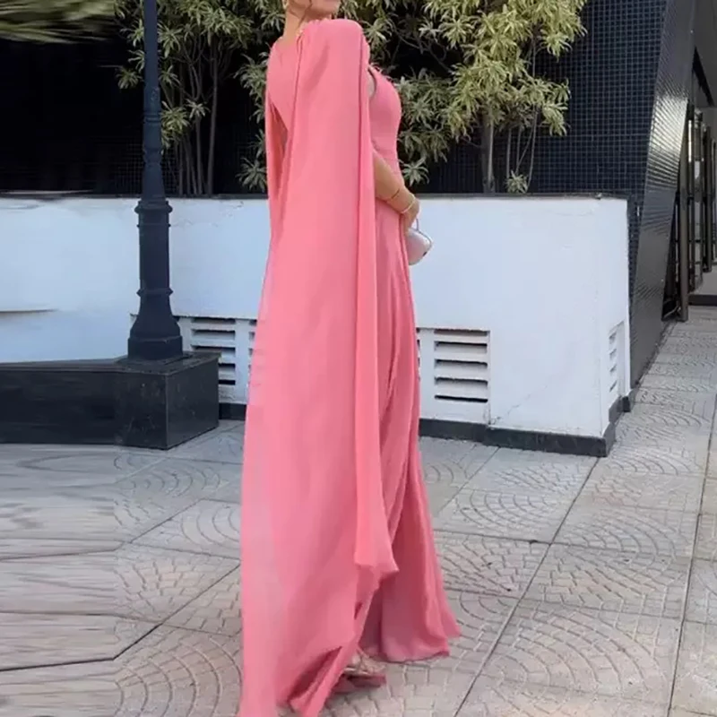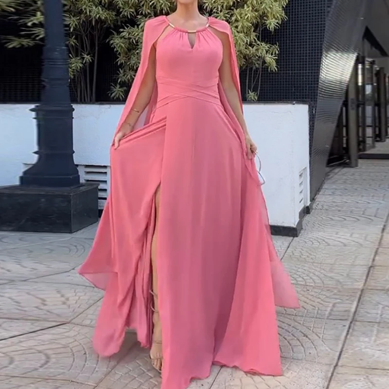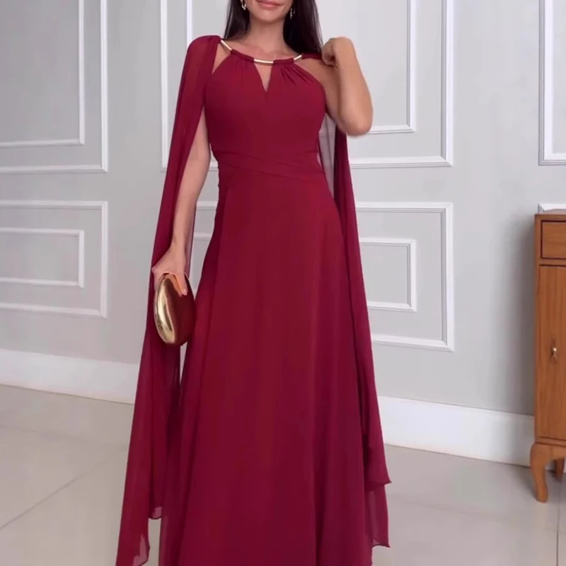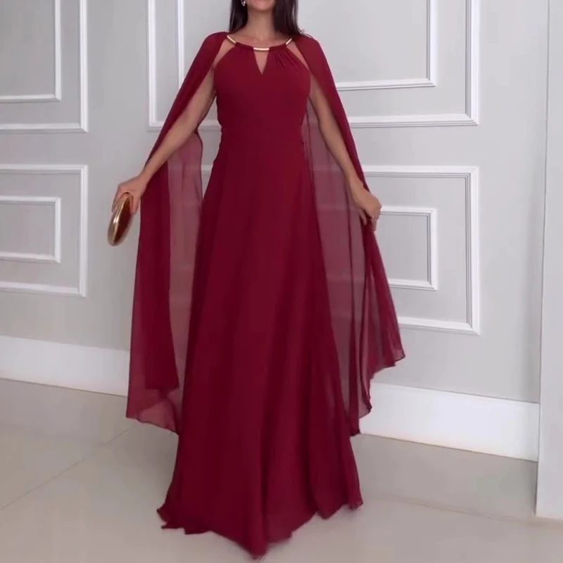 Elegant Hollow Out Pleated Evening Dress Summer Lady Solid Color High Waist Dresses Temperament Mesh Shawl Sleeve Banquet Dress