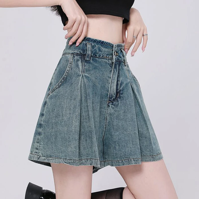 Korean Casual High Waisted Pleated Denim Shorts For Women Spring Summer Baggy Jeans Shorts Y2k A-Line Wide Leg Jeans