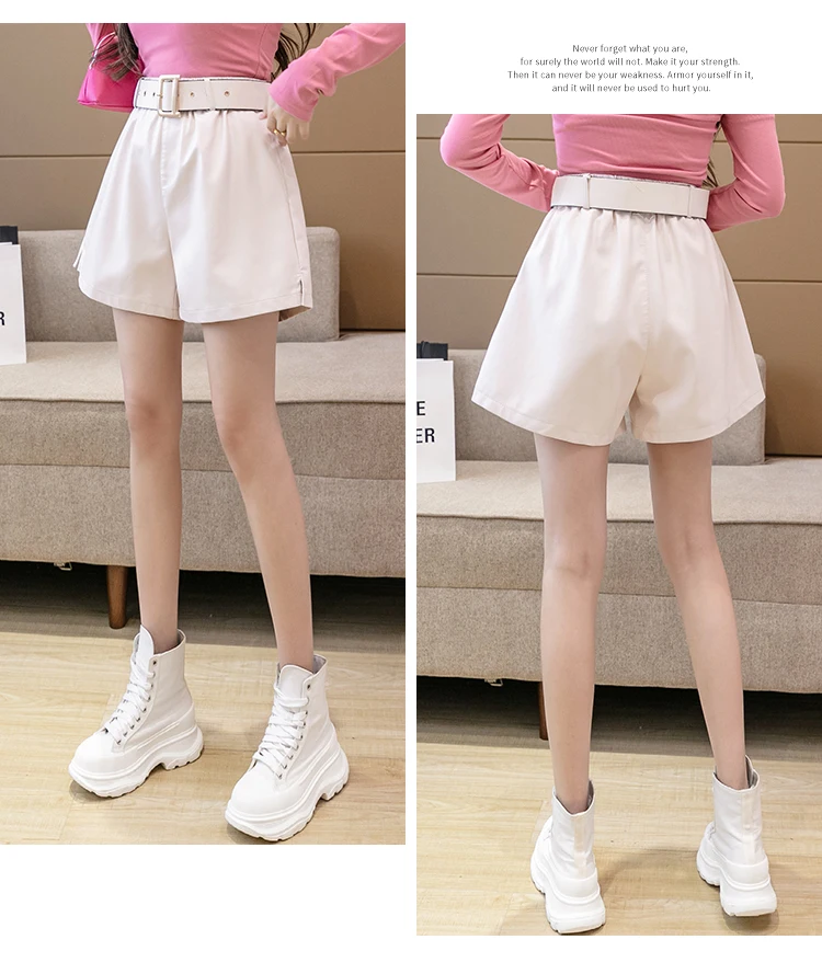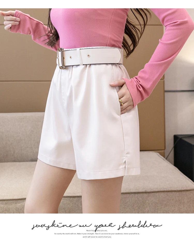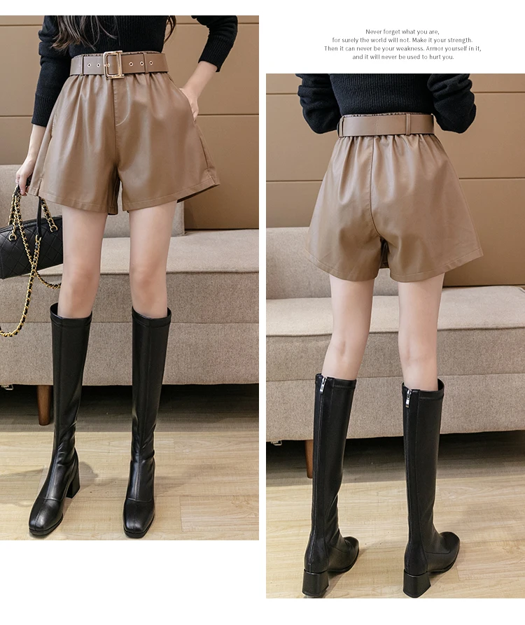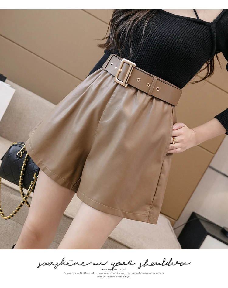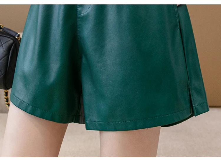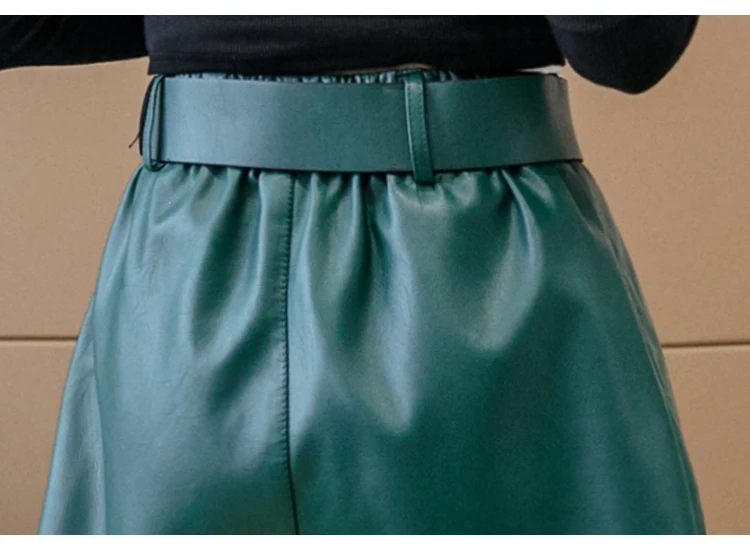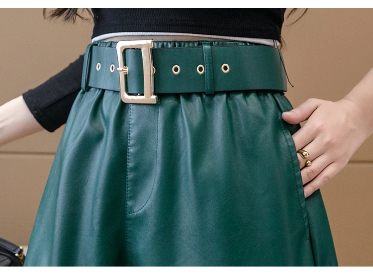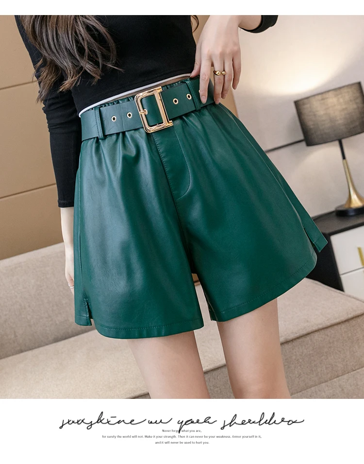 Seoulish Autumn Winter Green PU Women's A-line Shorts with Belted High Waist Wide Leg Loose Short Pants Female 2024 New