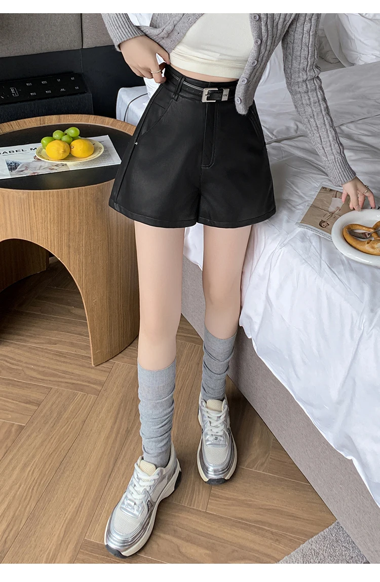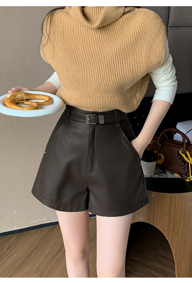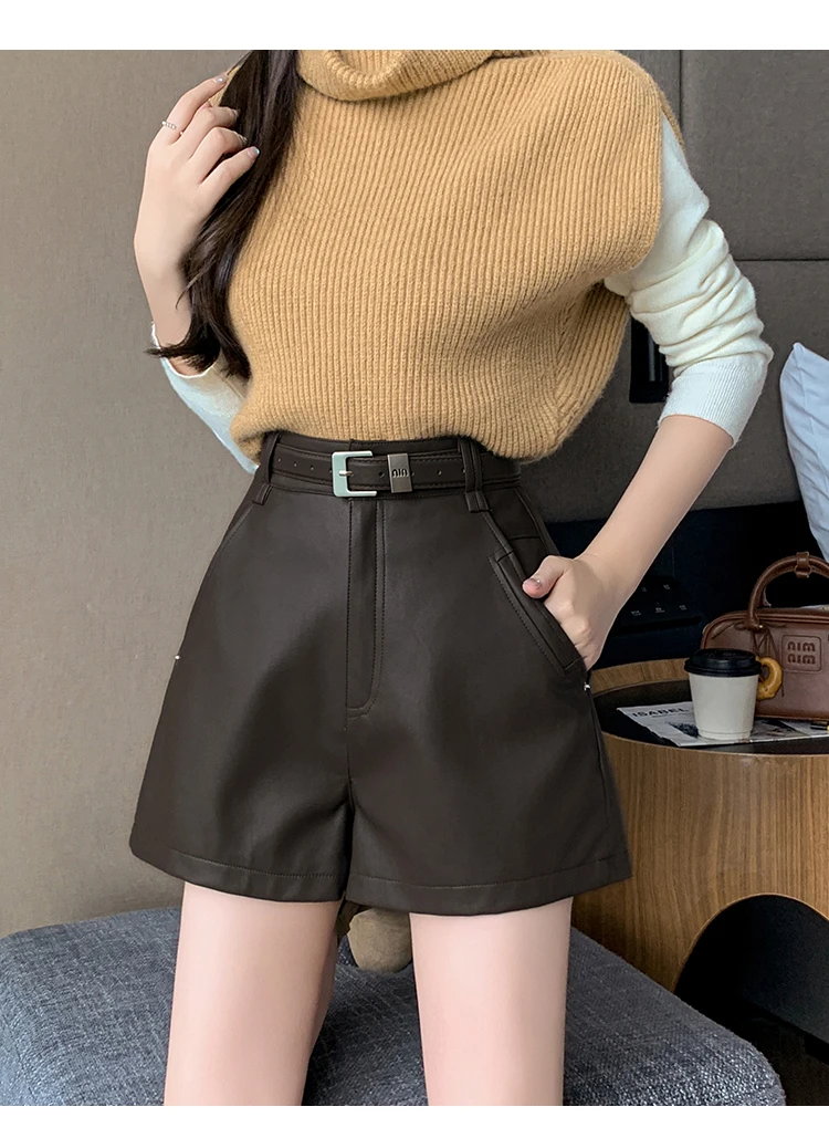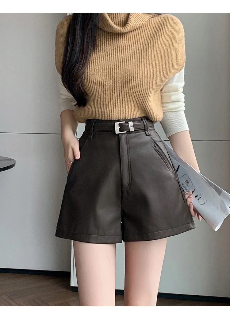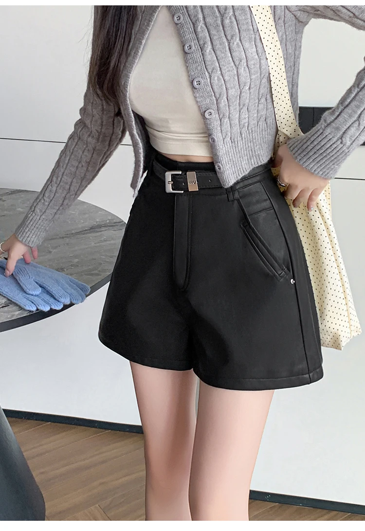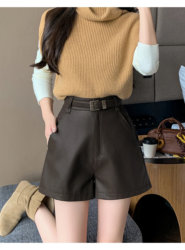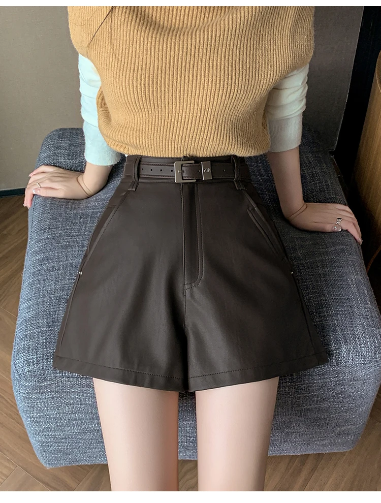 Seoulish Autumn Winter Vintage PU Leather Women's A-line Shorts with Belted Office High Waist Wide Leg Short Pants Female 2025