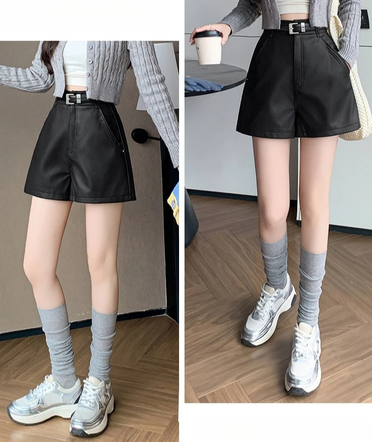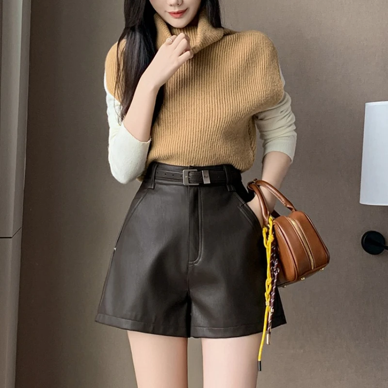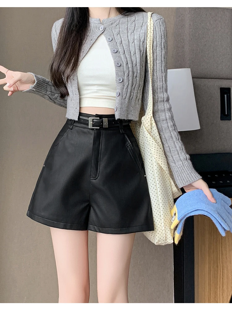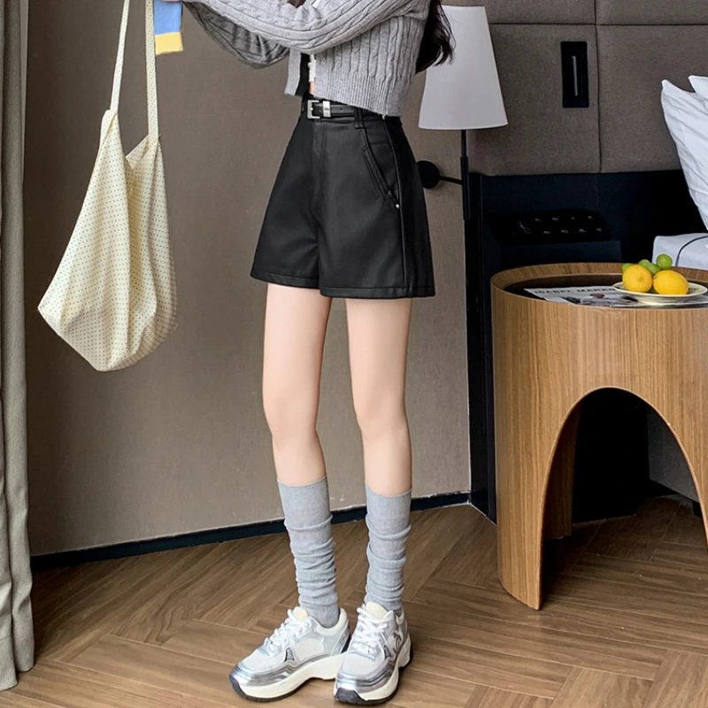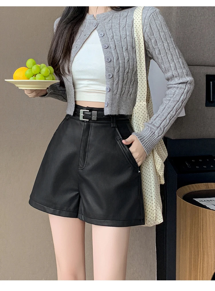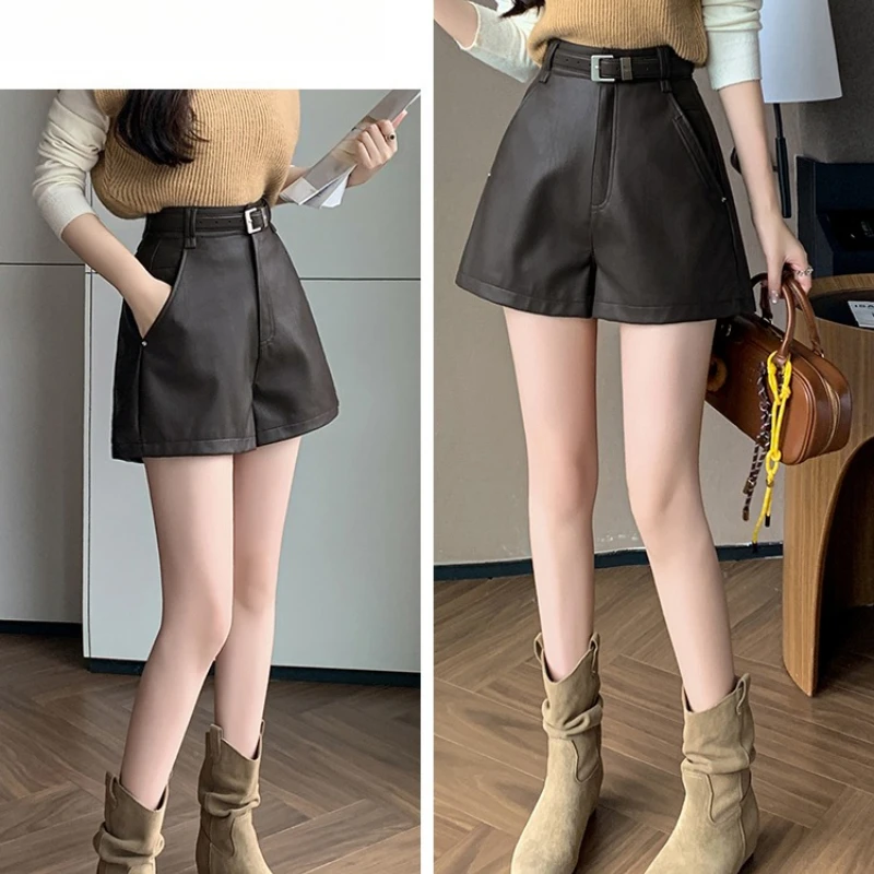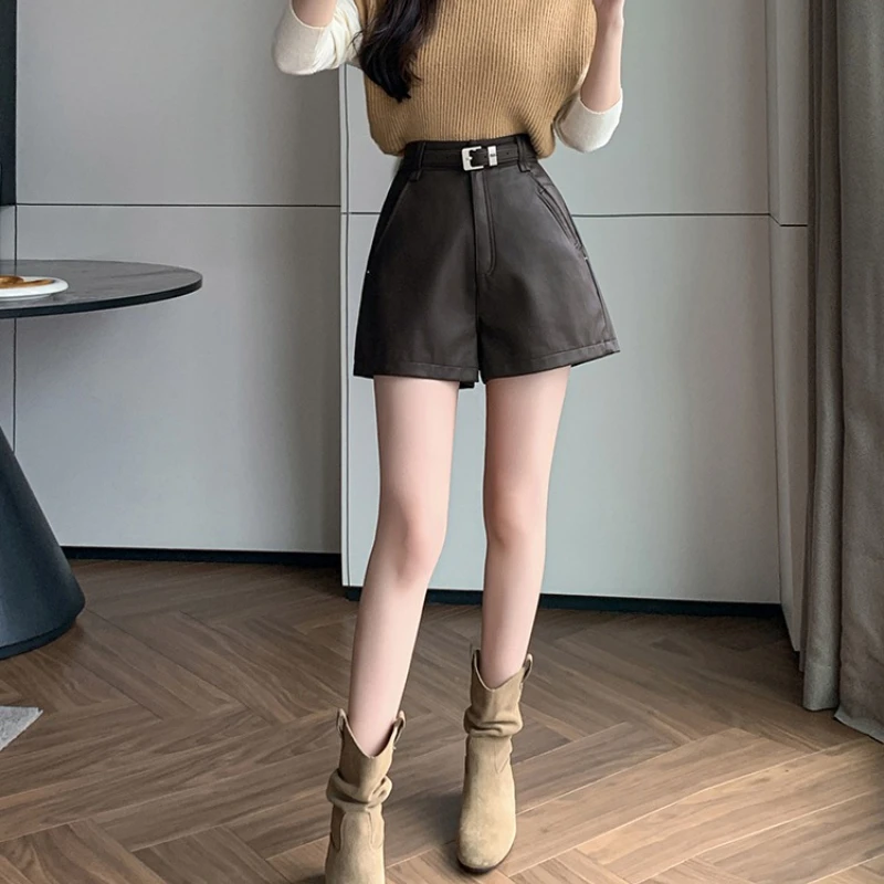 Seoulish Autumn Winter Vintage PU Leather Women's A-line Shorts with Belted Office High Waist Wide Leg Short Pants Female 2025
