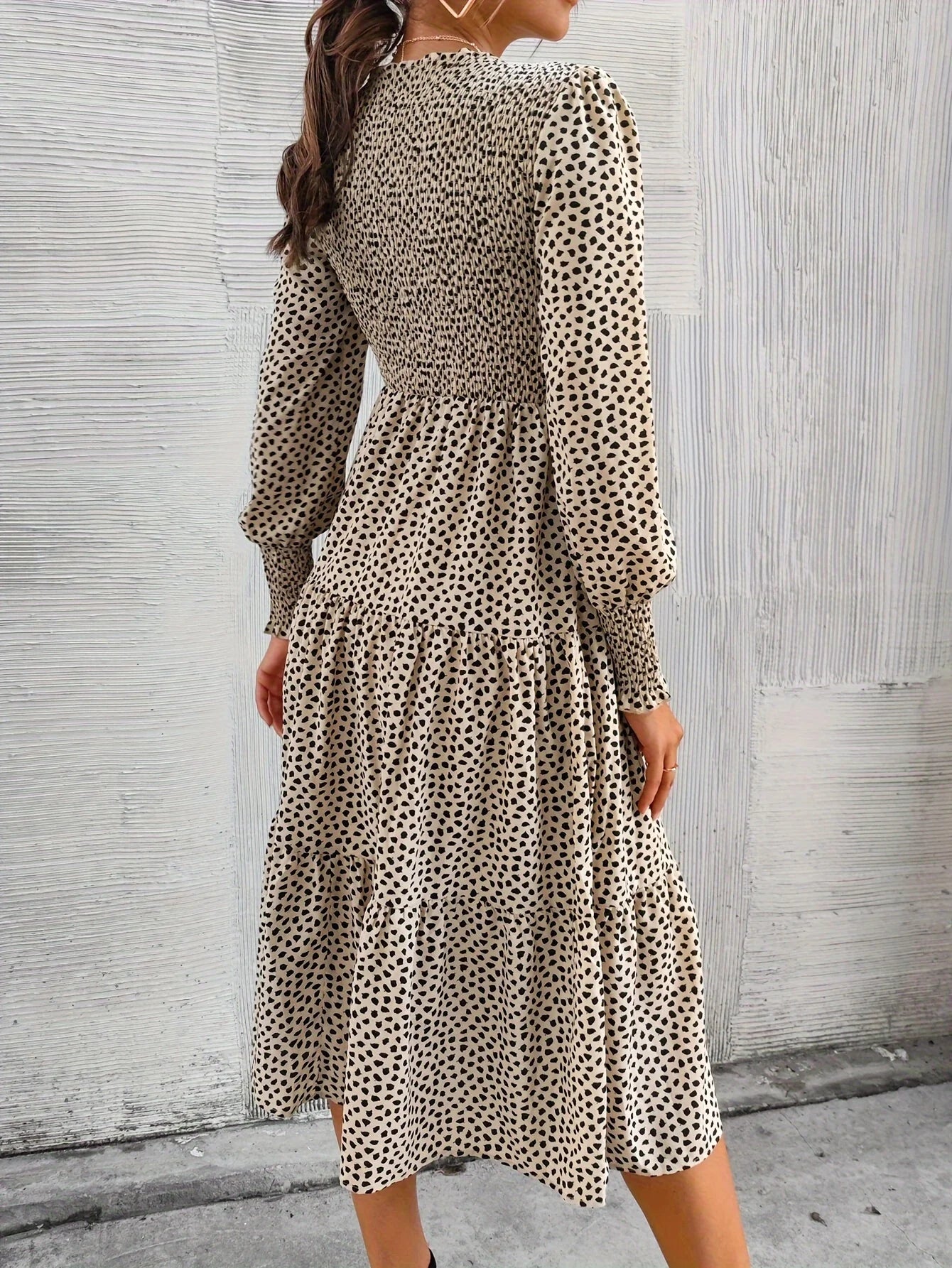 Featuring a chic beige and black dot print, this dress exudes elegance and sophistication for any autumn/winter occasion.